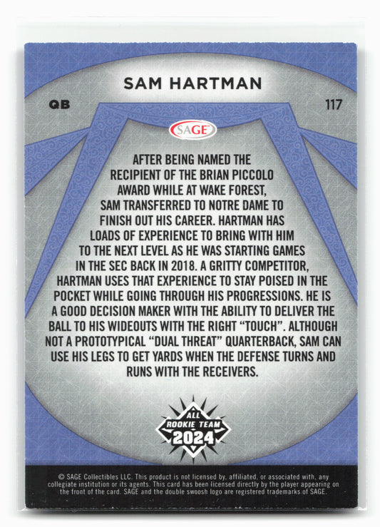 This is a nice example of a 2024 SAGE HIT #117 Sam Hartman Other important information about this card:In 2024 Sam Hartman played for the Notre Dame Fighting Irish.Please check...