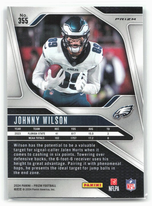 This is a nice example of a 2024 Panini Prizm #355 Johnny Wilson Green Other important information about this card:RCIn 2024 Johnny Wilson played for the Philadelphia Eagles.Please check out...