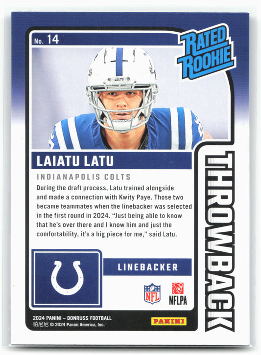 This is a nice example of a 2024 Donruss #14 Laiatu Latu Rated Rookies Throwback Other important information about this card:In 2024 Laiatu Latu played for the Indianapolis Colts.Please check...