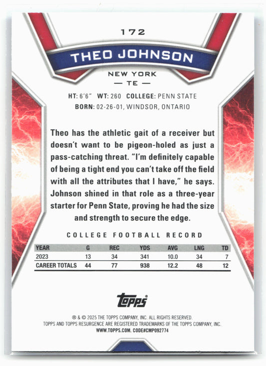 This is a nice example of a 2024 Topps Resurgence - Blue & Orange Spark #172 Theo Johnson Other important information about this card:RCIn 2024 Theo Johnson played for the...