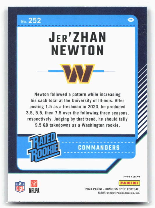 This is a nice example of a 2024 Donruss Optic #252 Jer'Zhan Newton Purple Shock Other important information about this card:In 2024 Jer'Zhan Newton played for the Washington Commanders.Please check...