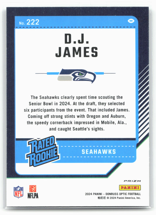 This is a nice example of a 2024 Donruss Optic #222 D.J. James Holo Other important information about this card:In 2024 D.J. James played for the Seattle Seahawks.Please check out...