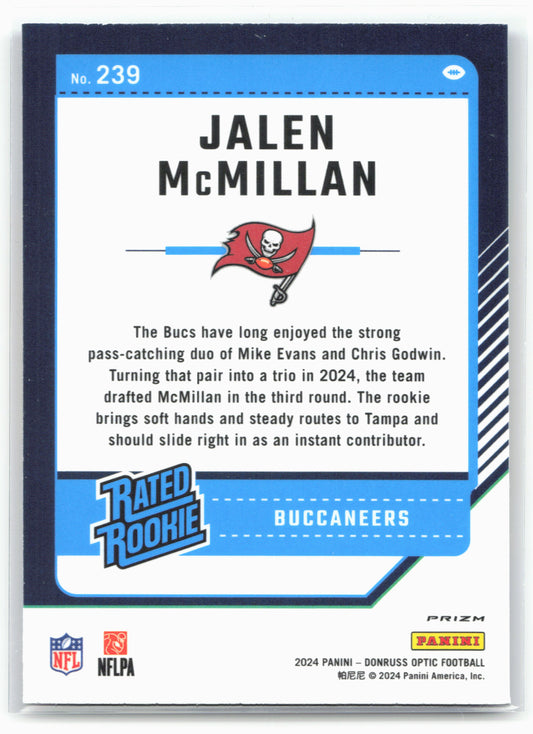 This is a nice example of a 2024 Donruss Optic #239 Jalen McMillan Blue Hyper Other important information about this card:In 2024 Jalen McMillan played for the Tampa Bay Buccaneers.Please...
