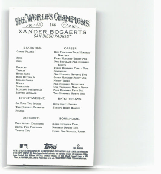 This is a nice example of a 2024 Topps Allen & Ginter #144 Xander Bogaerts Mini Black Border Other important information about this card:In 2024 Xander Bogaerts played for the...