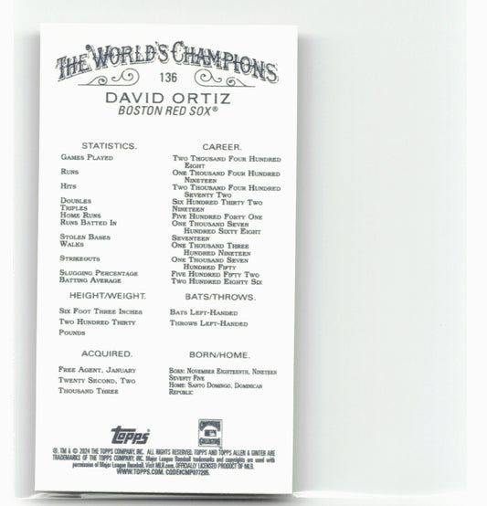 This is a nice example of a 2024 Topps Allen & Ginter #136 David Ortiz Mini Gold Border Other important information about this card:In 2024 David Ortiz played for the...
