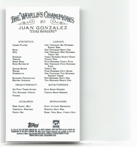 This is a nice example of a 2024 Topps Allen & Ginter #311 Juan Gonzalez Mini Gold Border Other important information about this card:In 2024 Juan Gonzalez played for the...