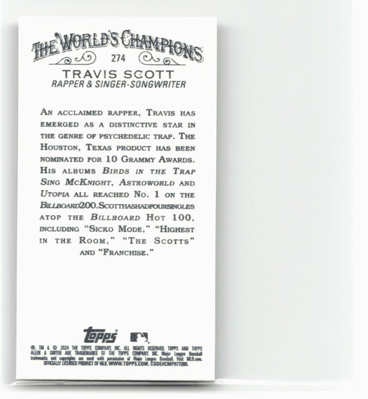 This is a nice example of a 2024 Topps Allen & Ginter #274 Travis Scott Mini Gold Border Other important information about this card:In 2024 Travis Scott played for the...