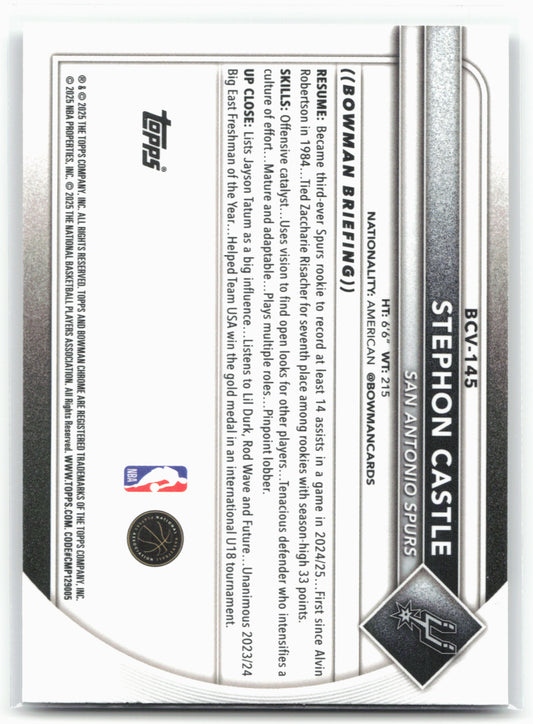 This is a nice example of a 2025-26 Bowman #BCV-145 Stephon Castle Chrome Other important information about this card:In 2025 Stephon Castle played for the San Antonio Spurs.Please check out...