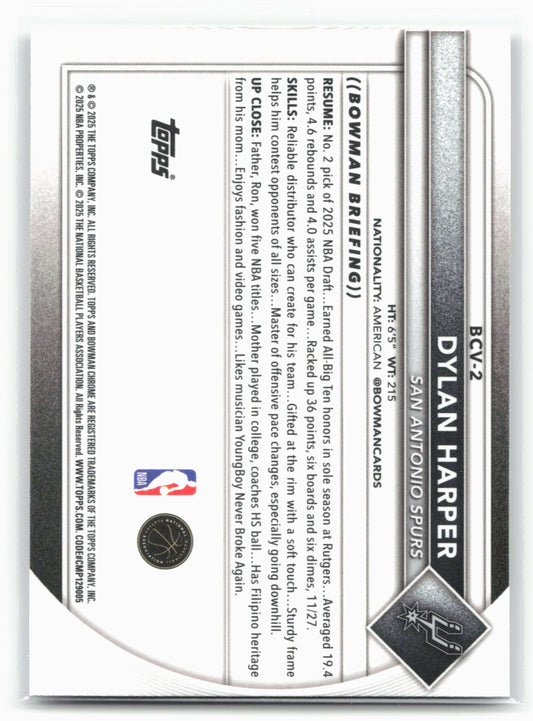 This is a nice example of a 2025-26 Bowman #BCV-2 Dylan Harper Chrome Other important information about this card:In 2025 Dylan Harper played for the San Antonio Spurs.Please check out...