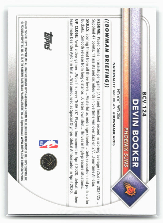 This is a nice example of a 2025-26 Bowman #BCV-124 Devin Booker Chrome Reptilian Refractor Other important information about this card:In 2025 Devin Booker played for the Phoenix Suns.Please check...