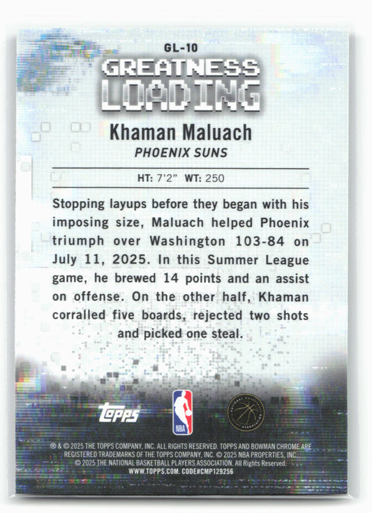 This is a nice example of a 2025-26 Bowman #GL-10 Khaman Maluach Greatness Loading Other important information about this card:In 2025 Khaman Maluach played for the Phoenix Suns.Please check out...