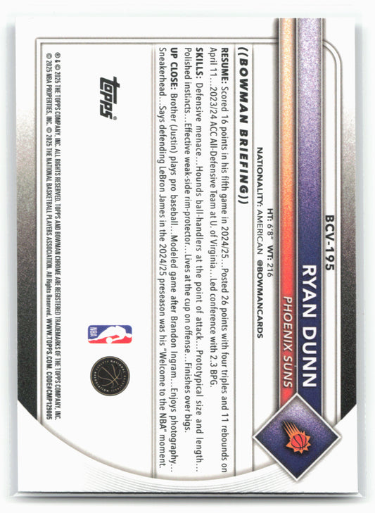 This is a nice example of a 2025-26 Bowman #BCV-195 Ryan Dunn Chrome Other important information about this card:In 2025 Ryan Dunn played for the Phoenix Suns.Please check out our...