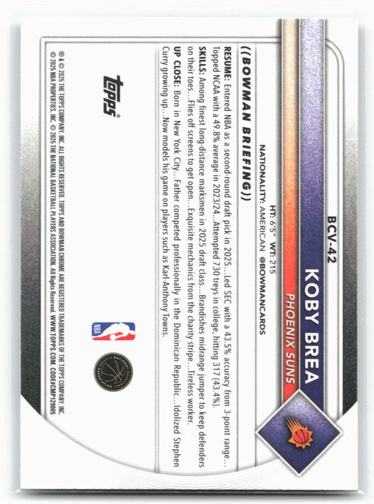 This is a nice example of a 2025-26 Bowman #BCV-42 Koby Brea Chrome Other important information about this card:In 2025 Koby Brea played for the Phoenix Suns.Please check out our...