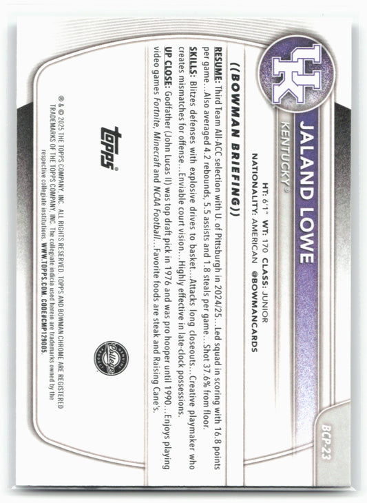 This is a nice example of a 2025-26 Bowman #BCP-23 Jaland Lowe Chrome Prospects Other important information about this card:In 2025 Jaland Lowe played for the Kentucky Wildcats.Please check out...