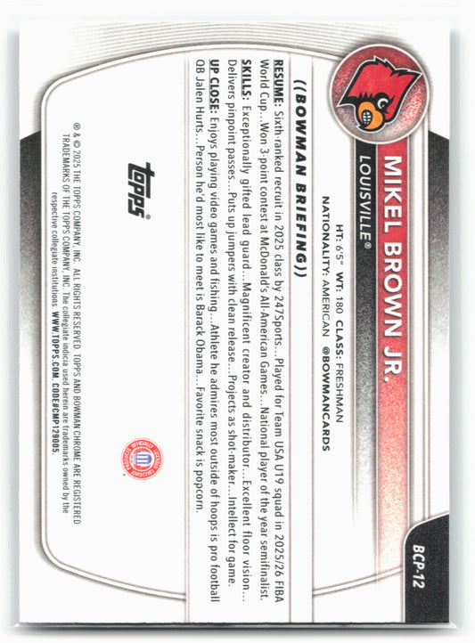 This is a nice example of a 2025-26 Bowman #BCP-12 Mikel Brown Jr. Chrome Prospects Other important information about this card:In 2025 Mikel Brown Jr. played for the Louisville Cardinals.Please...