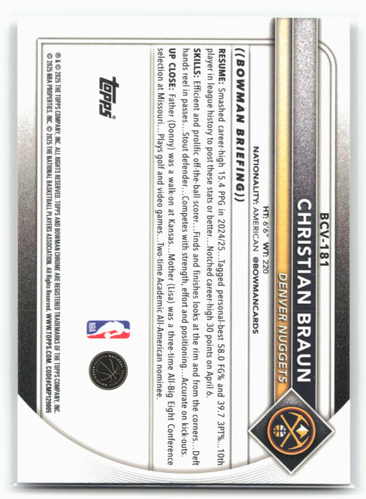 This is a nice example of a 2025-26 Bowman #BCV-181 Christian Braun Chrome Other important information about this card:In 2025 Christian Braun played for the Denver Nuggets.Please check out our...