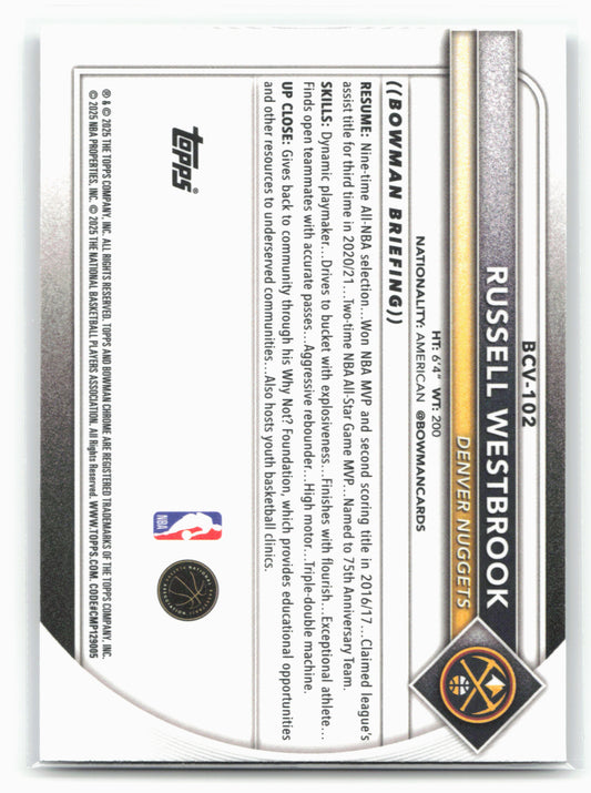 This is a nice example of a 2025-26 Bowman #BCV-102 Russell Westbrook Chrome Other important information about this card:In 2025 Russell Westbrook played for the Denver Nuggets.Please check out our...