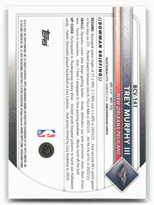 This is a nice example of a 2025-26 Bowman #BCV-141 Trey Murphy III Chrome Reptilian Refractor Other important information about this card:In 2025 Trey Murphy III played for the New...