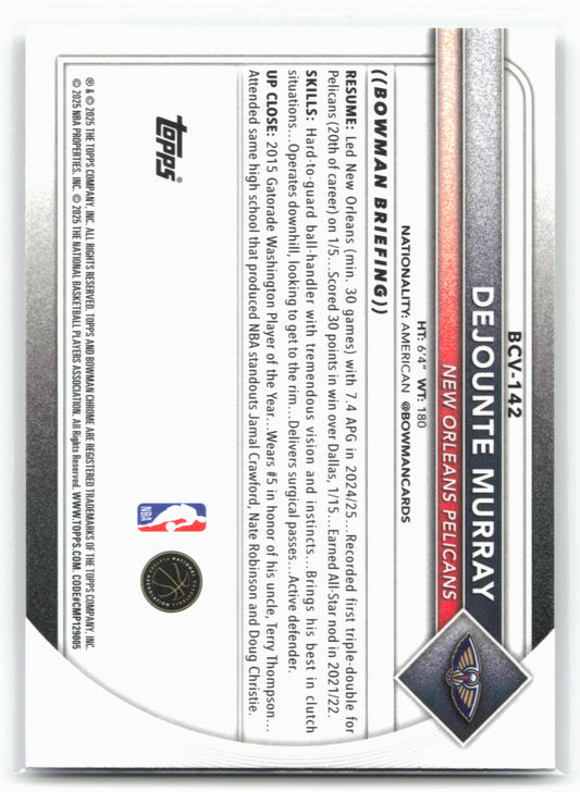 This is a nice example of a 2025-26 Bowman #BCV-142 Dejounte Murray Chrome Other important information about this card:In 2025 Dejounte Murray played for the New Orleans Pelicans.Please check out...