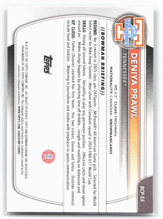 This is a nice example of a 2025-26 Bowman #BCP-55 Deniya Prawl Chrome Prospects Other important information about this card:In 2025 Deniya Prawl played for the Tennessee Volunteers.Please check out...