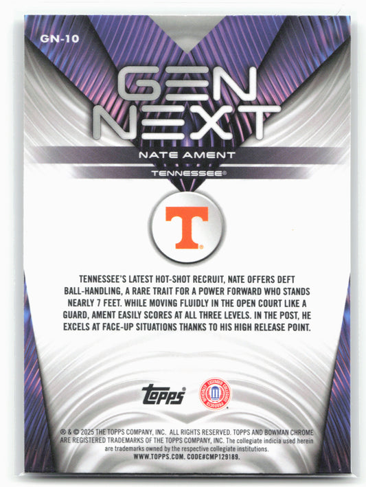 This is a nice example of a 2025-26 Bowman #GN-10 Nate Ament Gen Next Other important information about this card:In 2025 Nate Ament played for the Tennessee Volunteers.Please check out...