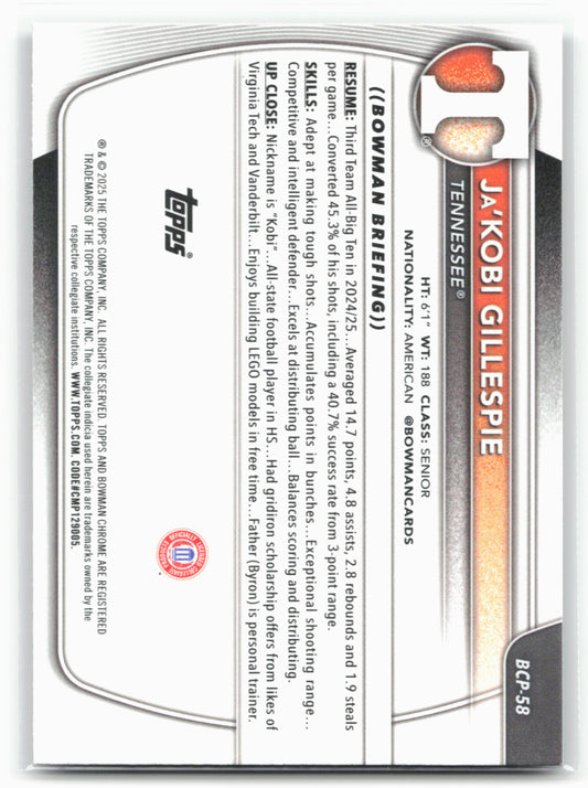 This is a nice example of a 2025-26 Bowman #BCP-58 Ja'Kobi Gillespie Chrome Prospects Reptilian Refractor Other important information about this card:In 2025 Ja'Kobi Gillespie played for the Tennessee Volunteers.Please...