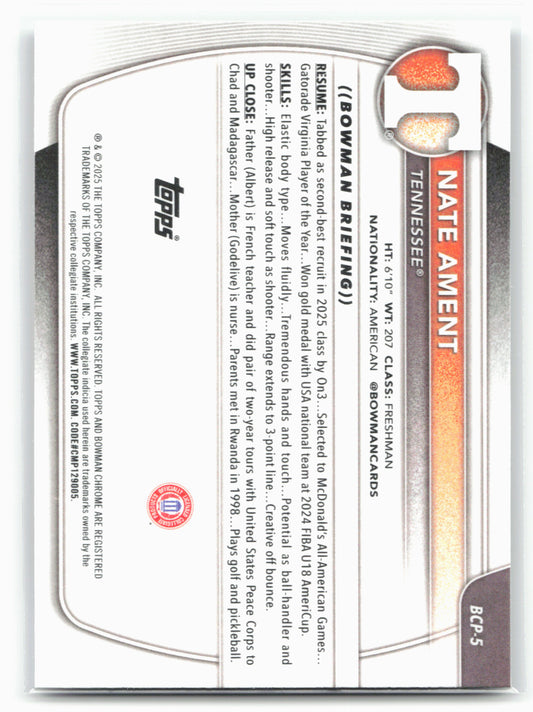 This is a nice example of a 2025-26 Bowman #BCP-5 Nate Ament Chrome Prospects Other important information about this card:In 2025 Nate Ament played for the Tennessee Volunteers.Please check out...