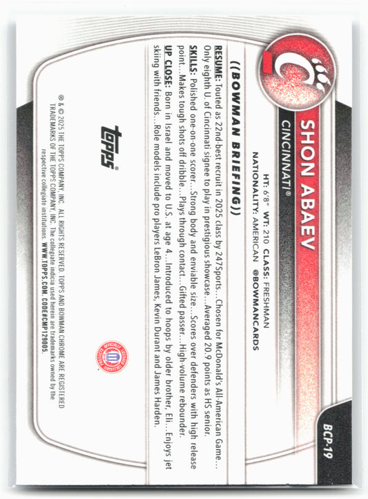 This is a nice example of a 2025-26 Bowman #BCP-19 Shon Abaev Chrome Prospects Other important information about this card:In 2025 Shon Abaev played for the Cincinnati Bearcats.Please check out...