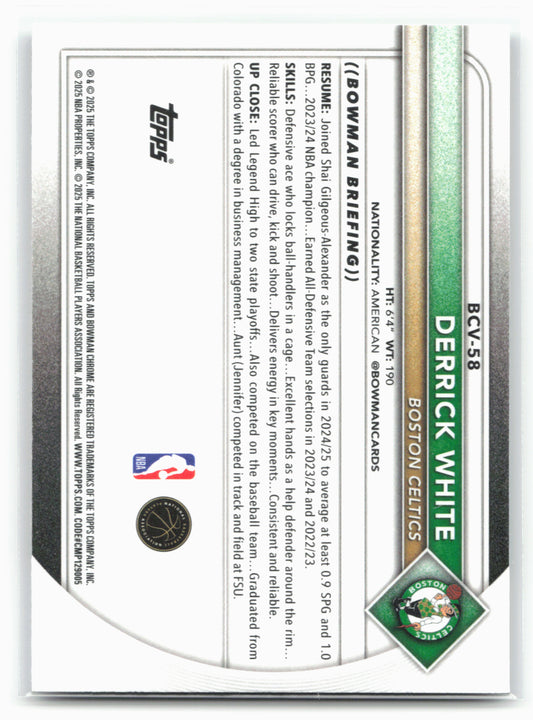 This is a nice example of a 2025-26 Bowman #BCV-58 Derrick White Chrome Other important information about this card:In 2025 Derrick White played for the Boston Celtics.Please check out our...