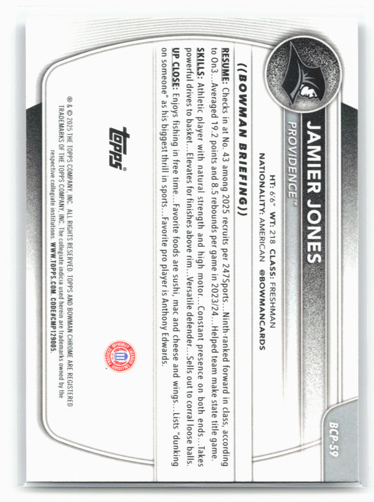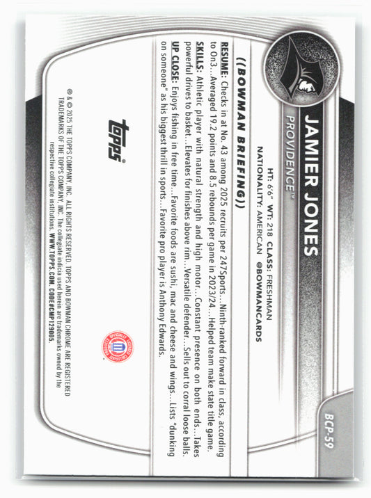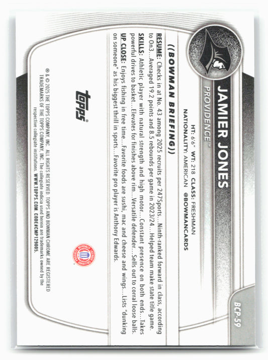 This is a nice example of a 2025-26 Bowman #BCP-59 Jamier Jones Chrome Prospects Other important information about this card:28143In 2025 Jamier Jones played for the Providence Friars.Please check out...