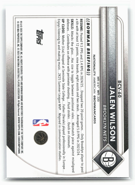 This is a nice example of a 2025-26 Bowman #BCV-60 Jalen Wilson Chrome Other important information about this card:In 2025 Jalen Wilson played for the Brooklyn Nets.Please check out our...