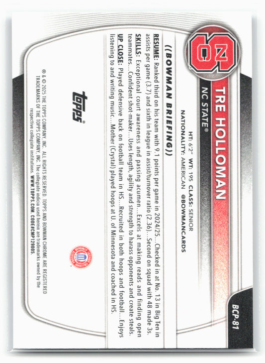 This is a nice example of a 2025-26 Bowman #BCP-81 Tre Holloman Chrome Prospects Other important information about this card:In 2025 Tre Holloman played for the NC State Wolfpack.Please check...