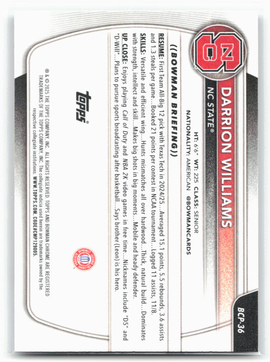 This is a nice example of a 2025-26 Bowman #BCP-36 Darrion Williams Chrome Prospects Other important information about this card:In 2025 Darrion Williams played for the NC State Wolfpack.Please check...