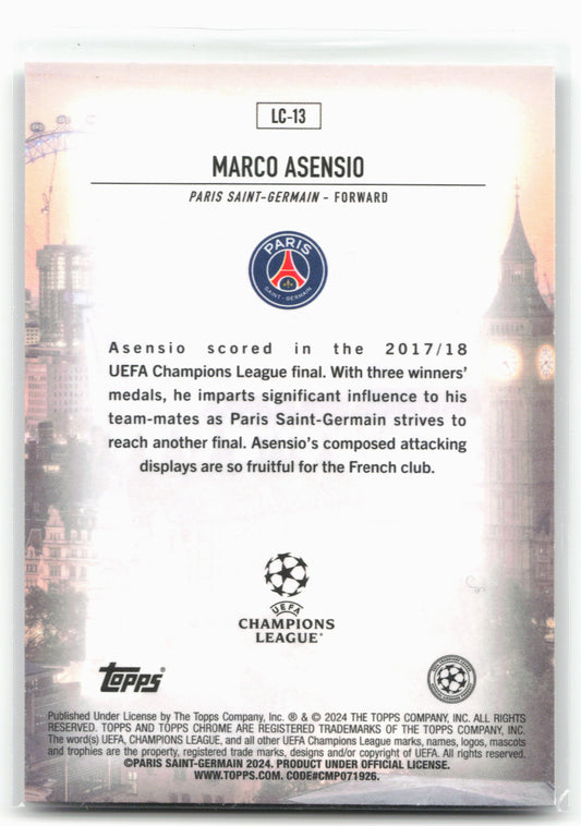 This is a nice example of a 2023-24 Topps Chrome UEFA Club Competitions #LC-13 Marco Asensio London Calling Other important information about this card:In 2023 Marco Asensio played for the...