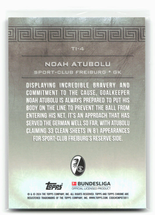 This is a nice example of a 2023-24 Topps Chrome Bundesliga #TI-4 Noah Atubolu Titans Titanium Other important information about this card:In 2023 Noah Atubolu played for the SC Freiburg.Please...