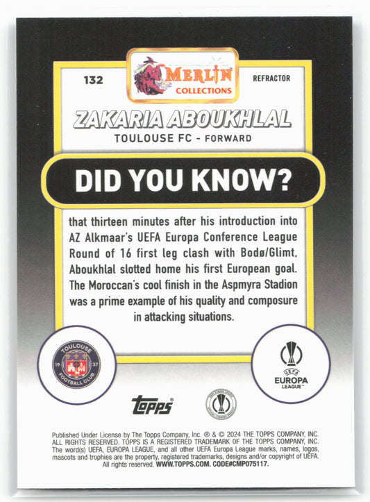 This is a nice example of a 2023-24 Merlin UEFA Club Competitions #132 Zakaria Aboukhlal Refractor Other important information about this card:In 2023 Zakaria Aboukhlal played for the Toulouse FC.Please...