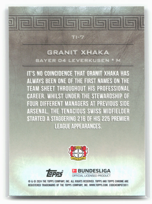 This is a nice example of a 2023-24 Topps Chrome Bundesliga #TI-7 Granit Xhaka Titans Titanium Other important information about this card:In 2023 Granit Xhaka played for the Bayer 04...