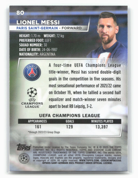 This is a nice example of a 2022-23 Stadium Club Chrome UEFA Club Competitions #80 Lionel Messi Other important information about this card:27442In 2022 Lionel Messi played for the Paris...