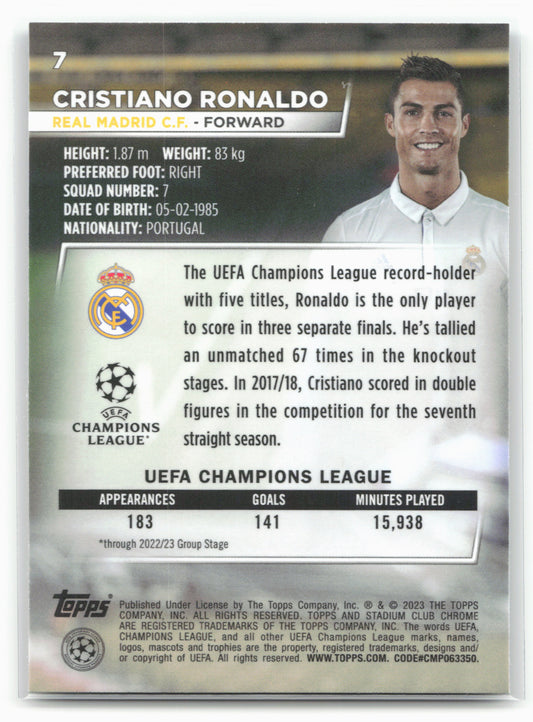 This is a nice example of a 2022-23 Stadium Club Chrome UEFA Club Competitions #7 Cristiano Ronaldo Other important information about this card:27443In 2022 Cristiano Ronaldo played for the Real...