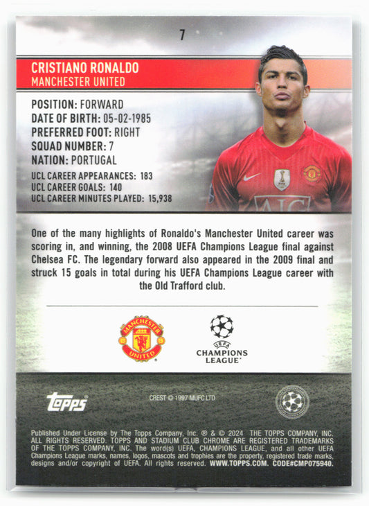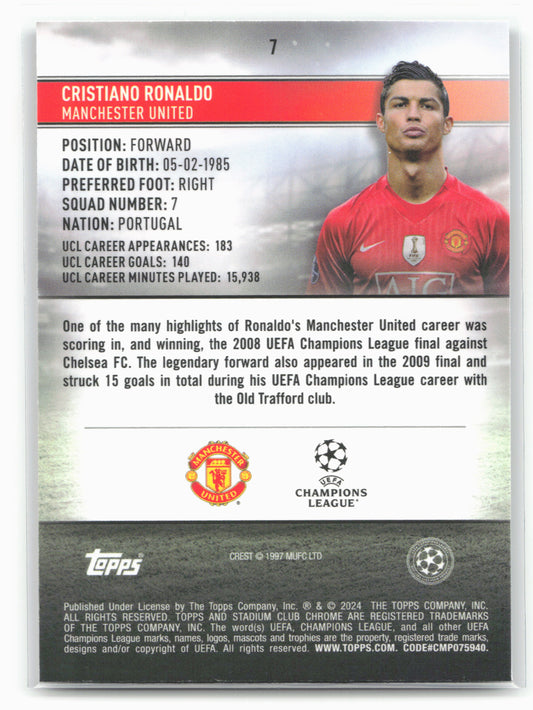 This is a nice example of a 2023-24 Stadium Club Chrome UEFA Champions League #7 Cristiano Ronaldo Other important information about this card:27446In 2023 Cristiano Ronaldo played for the Manchester...