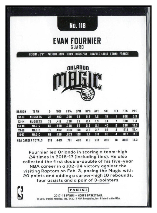 This is a nice example of a 2017-18 Hoops #118 Evan Fournier Other important information about this card:In 2017 Evan Fournier played for the Orlando Magic.Please check out our other...