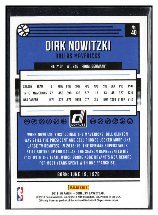 This is a nice example of a 2018-19 Donruss #40 Dirk Nowitzki Other important information about this card:In 2018 Dirk Nowitzki played for the Dallas Mavericks.Please check out our other...