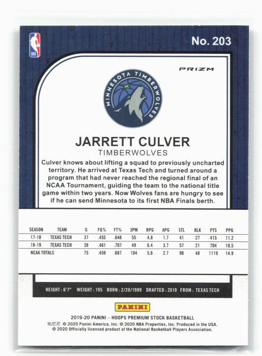 This is a nice example of a 2019-20 Hoops Premium Stock #203 Jarrett Culver Prizms Silver Other important information about this card:RCIn 2019 Jarrett Culver played for the Minnesota Timberwolves.Please...