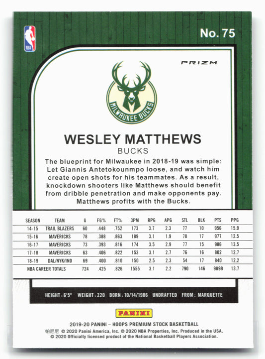 This is a nice example of a 2019-20 Hoops Premium Stock #75 Wesley Matthews Prizms Silver Laser Other important information about this card:In 2019 Wesley Matthews played for the Milwaukee...