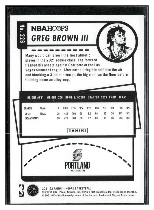This is a nice example of a 2021-22 Hoops #226 Greg Brown III Other important information about this card:RCIn 2021 Greg Brown III played for the Portland Trail Blazers.Please check...