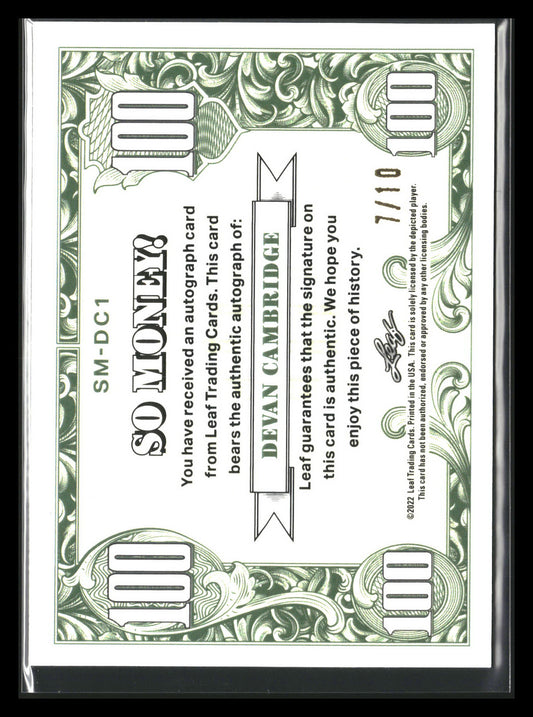 This is a nice example of a 2021-22 Leaf Metal #SM-DC1 Devan Cambridge So Money Autographs Green Rainbow Other important information about this card:AU,SNIn 2021 Devan Cambridge played for the...