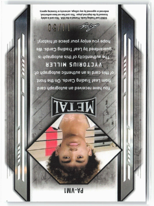 This is a nice example of a 2021-22 Leaf Metal #PA-VM1 Vyctorius Miller Portrait Autographs Blue Rainbow Other important information about this card:AU,SNIn 2021 Vyctorius Miller played for the College.Please...