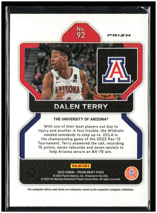 This is a nice example of a 2022 Panini Prizm Draft Picks #92 Dalen Terry Green Other important information about this card:In 2022 Dalen Terry played for the Arizona Wildcats.Please...