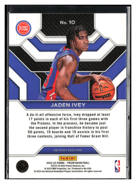 This is a nice example of a 2022-23 Panini Prizm #10 Jaden Ivey Emergent Other important information about this card:In 2022 Jaden Ivey played for the Detroit Pistons.Please check out...