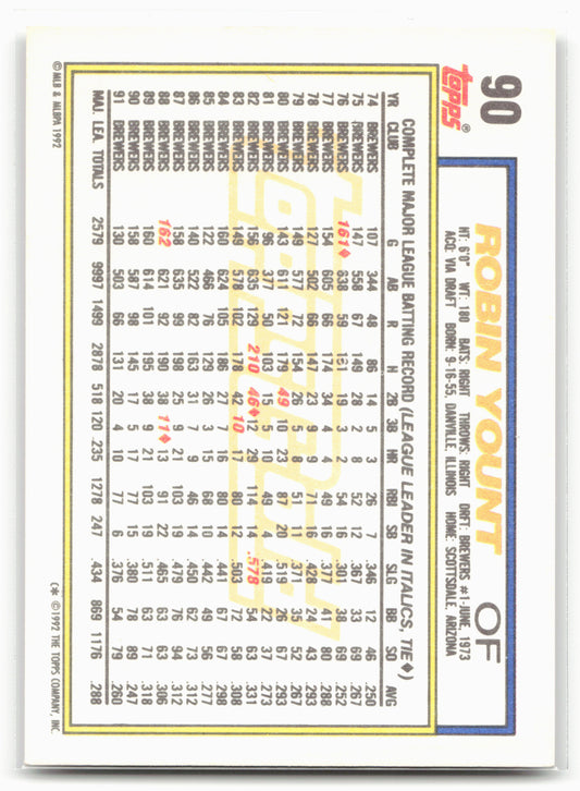 This is a nice example of a 1992 Topps #90 Robin Yount Gold Winners Other important information about this card:In 1992 Robin Yount played for the Milwaukee Brewers.Please check out...